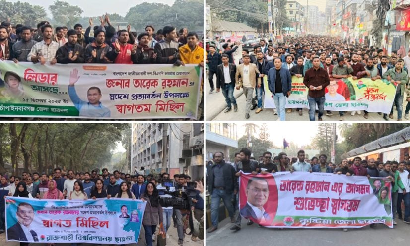 চাঁপাইনবাবগঞ্জ: তারেক রহমানের স্বদেশ প্রত্যাবর্তন উপলক্ষ্যে চাঁপাইনবাবগঞ্জ জেলা ছাত্রদলের উদ্যোগে স্বাগত ও আনন্দ মিছিল অনুষ্ঠিত হয়েছে। বিকেলে নবাবগঞ্জ সরকারি কলেজের সামনে থেকে মিছিলটি শুরু হয়ে শহরের গুরুত্বপূর্ণ সড়কসমূহ প্রদক্ষিণ করে পুনরায় একই স্থানে এসে শেষ হয়। মিছিল চলাকালে ছাত্রদল নেতাকর্মীরা তারেক রহমানের স্বদেশ প্রত্যাবর্তনকে গণতন্ত্র পুনরুদ্ধারের পথে একটি ঐতিহাসিক অধ্যায় হিসেবে উল্লেখ করে বিভিন্ন স্লোগান দেন।