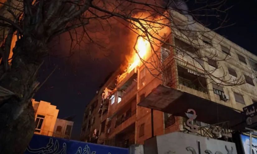 সিরিয়ার আলেপ্পোতে সংঘর্ষের পর একটি ভবনে আগুনের শিখা দেখা যাচ্ছে। ছবি: এপি