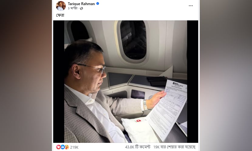 ঢাকা: দীর্ঘ প্রবাসজীবনের ইতি টেনে দেশে ফেরার পথে বিএনপির ভারপ্রাপ্ত চেয়ারম্যান তারেক রহমান। বৃহস্পতিবার (২৫ ডিসেম্বর) সকালে নিজের ভেরিফায়েড ফেসবুক পেজে ‘ফেরা’ ক্যাপশন দিয়ে একটি ছবি পোস্ট করেন তিনি।