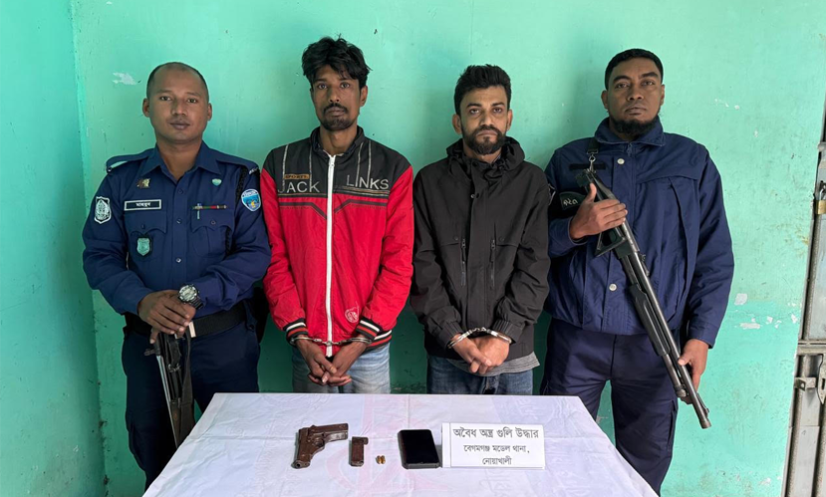 নোয়াখালী: নোয়াখালীর বেগমগঞ্জ উপজেলার চৌমুহনীর রিয়াদ আবাসিক হোটেল থেকে বাসু (৪০) ও জাহিদ হাসান রাসেল (৪২) নামের দুইজনকে আটক করেছে পুলিশ। এসময় তাদের কাছ থেকে একটি বিদেশি পিস্তল ও দুই রাউন্ড গুলি জব্দ করা হয়েছে।