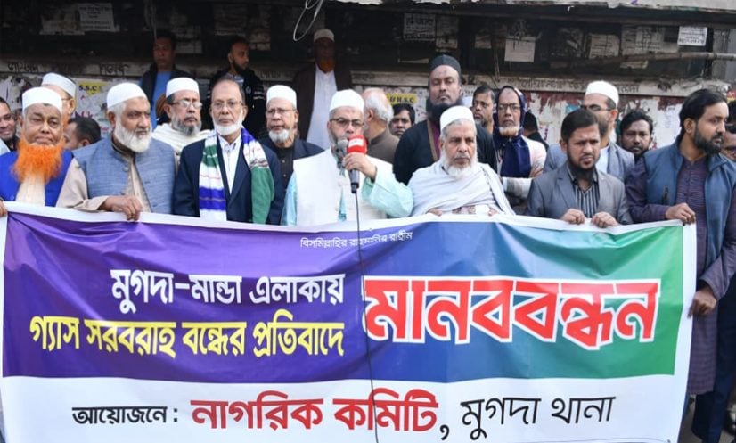 ঢাকা: রাজধানীর মুগদায় গ্যাস সরবরাহ বন্ধের প্রতিবাদে মুগদা নাগরিক কমিটির উদ্যোগে শনিবার(১৭ জানুয়ারি) সকালে এক মানববন্ধন কর্মসূচি অনুষ্ঠিত হয়। অনুষ্ঠিত মানববন্ধনে স্থানীয় কয়েকশ নারী-পুরুষ অংশগ্রহণ করেন। নাগরিক কমিটি মুগদা থানা সভাপতি সৈয়দ মুস্তাক আলী কাউসারের সভাপতিত্বে এবং সেক্রেটারি অ্যাডভোকেট মাইন উদ্দীন ফারুকীর পরিচালনায় অনুষ্ঠিত মানববন্ধনে প্রধান অতিথি হিসেবে উপস্থিত ছিলেন বাংলাদেশ শ্রমিক কল্যাণ ফেডারেশনের কেন্দ্রীয় সহ-সভাপতি কবির আহমেদ। আরও উপস্থিত ছিলেন ৬ নং ওয়ার্ড কাউন্সিলর পদপ্রার্থী এহসানুল মাহবুব জোবায়ের, ৭ নং ওয়ার্ড কাউন্সিলর পদপ্রার্থী মাওলানা মতিউর রহমান আকন্দ, ৭২ নং ওয়ার্ড কাউন্সিলর পদপ্রার্থী মাওলানা ইসহাকসহ স্থানীয় বিভিন্ন পর্যায়ের নেতারা।