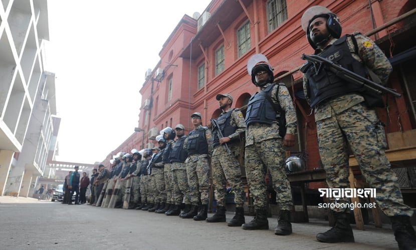 আজ সকালে কঠোর নিরাপত্তার মধ্যে চিন্ময়সহ ২৩ আসামিকে আদালতে হাজির করা হয়। ছবি: সারাবাংলা