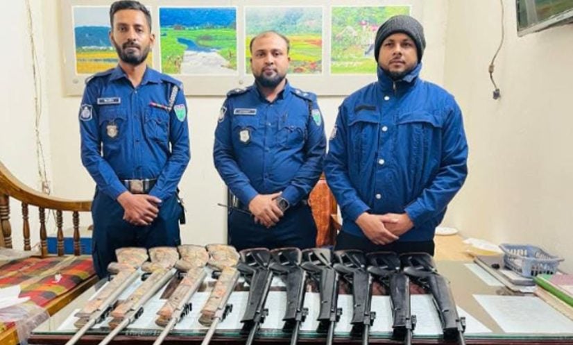 এ সময় বস্তা তল্লাশি করে ভারতীয় ৪টি ক্যামো রংয়ের নতুন এয়ারগান ও ৬টি কালো রংয়ের নতুন এয়ারগান এবং ১টি পুরাতন সুজুকি জিক্সার মোটরসাইকেল জব্দ করা হয়।