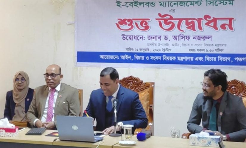 পঞ্চগড়: পঞ্চগড়সহ আট জেলায় ই-বেইলবন্ড ম্যানেজমেন্ট সিস্টেমের উদ্বোধন করা হয়েছে। সচিবালয় প্রান্তে প্রধান অতিথি হিসেবে উপস্থিত থেকে ভার্চুযালি যুক্ত হয়ে আইন, বিচার ও সংসদ বিষয়ক মন্ত্রণালয়ের উপদেষ্টা ড. আসিফ নজরুল এ কার্যক্রমের উদ্বোধন করেন।