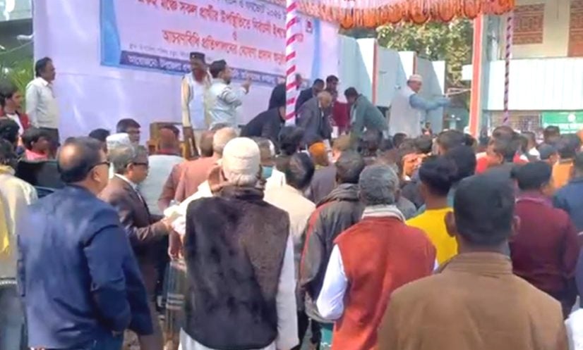 সিরাজগঞ্জ: সিরাজগঞ্জ-৪ (উল্লাপাড়া) আসনে একই মঞ্চে সব প্রার্থীর উপস্থিতিতে নির্বাচনি ইশতেহার পাঠ ও আচরণবিধি প্রতিপালন ঘোষণা অনুষ্ঠানে গণভোটে ‘না’ ভোট দেওয়ার আহ্বানকে কেন্দ্র করে হট্টগোল ও উত্তেজনার সৃষ্টি হয়েছে।