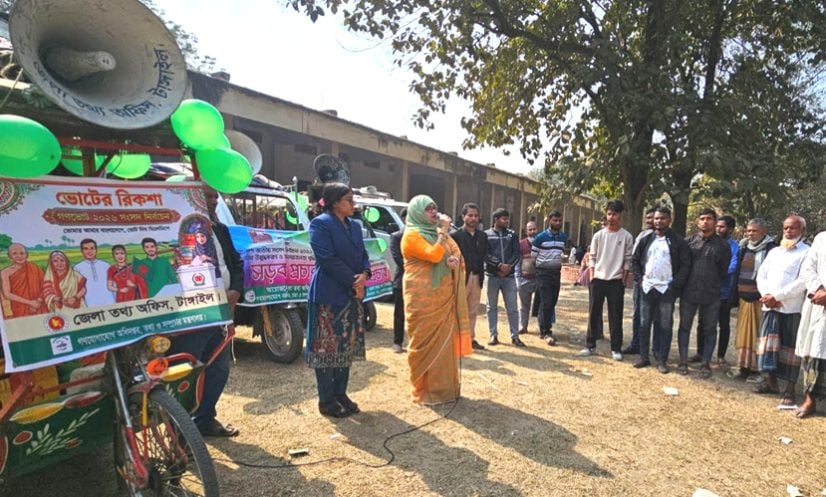 টাঙ্গাইল: আসন্ন ত্রয়োদশ জাতীয় সংসদ নির্বাচন ও গণভোট উপলক্ষে জেলা তথ্য অফিসের আয়োজনে টাঙ্গাইলে ‘ভোটের রিকশা’ প্রচার কার্যক্রমের উদ্বোধন করা হয়েছে।