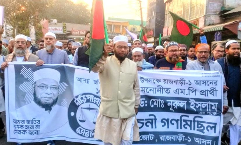 রাজবাড়ী-১ আসনের ১০ দলীয় জোটের প্রার্থী জেলা জামায়াতে ইসলামীর আমীর ও কেন্দ্রীয় মজলিসের শূরার সদস্য অ্যাডভোকেট মো. নূরুল ইসলাম বলেন, আগামী ১২ ফেব্রুয়ারি জাতীয় সংসদ নির্বাচন ও গণভোট অনুষ্ঠিত হবে। এই নির্বাচনটা বাংলাদেশের মানুষের জন্য অত্যন্ত গুরুত্বপূর্ণ নির্বাচন। দেশের পরিবর্তনের জন্য ও সংস্কারের জন্য নির্বাচনটা ঐতিহাসিক হতে যাচ্ছে। এই নির্বাচনের মধ্যে দিয়ে বাংলাদেশ জামায়াতে ইসলামী ক্ষমতায় আসলে দেশে ইনসাফ কায়েম হবে।সুদ, ঘুষ,দুর্নীতি মুক্ত, চাঁদাবাজ মুক্ত রাষ্ট্র গড়ে তোলা হবে। রাজবাড়ী-১ আসনের মানুষের জন্য শিক্ষা, স্বাস্থ্য, অবকাঠামো, কৃষিতে উন্নয়ন করা হবে। তাই এই নির্বাচনে দাঁড়িপাল্লা মার্কায় ভোট দিয়ে দশ দলীয় জোটকে ক্ষমতায় আনার আহ্বান জানান তিনি।