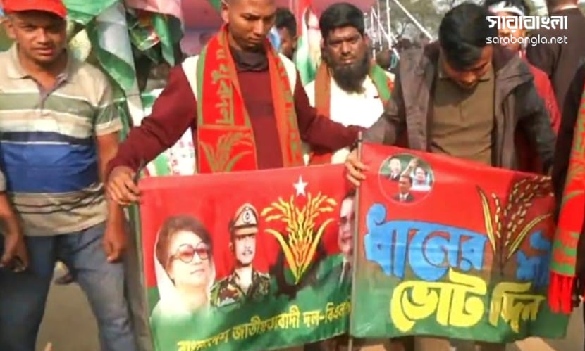 নেতাকর্মীদের কেউ কেউ মাথায় বেঁধেছেন দলীয় পতাকা। কারও কারও মাথায় লাল-সবুজের জাতীয় পতাকা। অনেকে ধানের শীষে ভোট দেওয়ার আহ্বান জানানো ব্যানার-ফেস্টুন বহন করছেন।