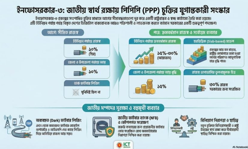 ঢাকা: আইসিটি বিভাগের অধীন জাতীয় অগ্রাধিকার প্রকল্প ইনফোসরকার-৩ এর পরিচালনার জন্যে পাবলিক-প্রাইভেট পার্টনারশিপ (পিপিপি) চুক্তির একটি গুরুত্বপূর্ণ সংশোধন সম্পন্ন হয়েছে। বর্তমান অন্তর্বর্তীকালীন সরকার ছয় মাসের বেশি সময় ধরে পুনঃআলোচনার মাধ্যমে পূর্ববর্তী চুক্তির একাধিক সীমাবদ্ধতা দূর করেছে এবং সরকারের রাজস্ব স্বার্থ ও জাতীয় ডিজিটাল অবকাঠামো ব্যবহারে কাঠামোগত পরিবর্তন এনেছে।