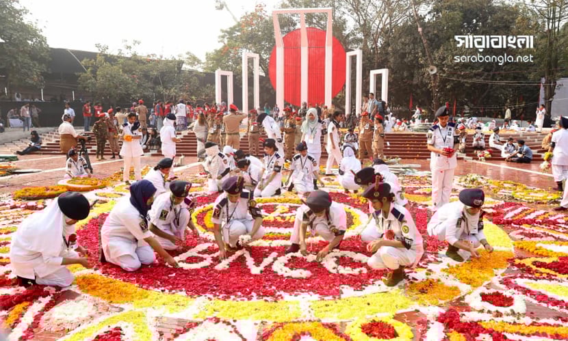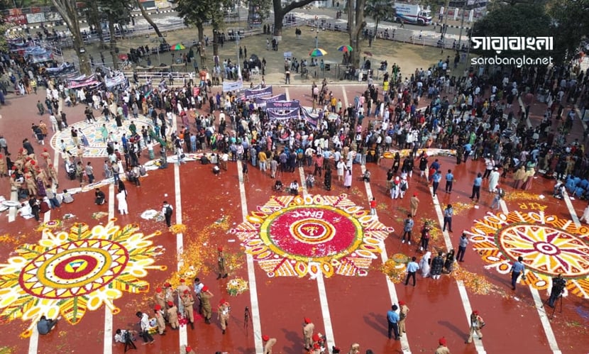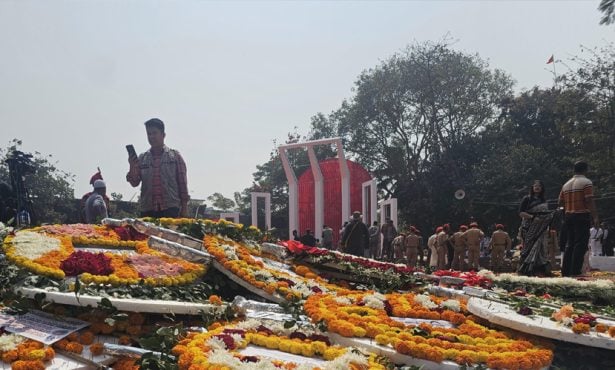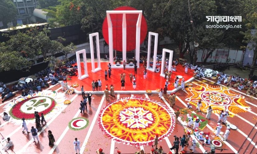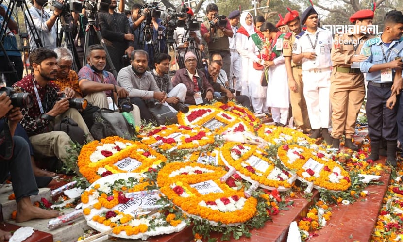 সকাল থেকেই ঢাকার রাজপথ গিয়ে মিশেছে এক ঠিকানায়- কেন্দ্রীয় শহীদ মিনার। হাতে ফুল আর পরনে সাদা-কালো পোশাক, চোখেমুখে বিনম্র শ্রদ্ধার ছাপ। একে একে সারিবদ্ধভাবে মানুষ এগিয়ে যাচ্ছেন বেদির দিকে। একেকটি পুষ্পস্তবক যখন বেদিতে রাখা হচ্ছে, মনে হচ্ছে যেন ভাষা শহিদদের প্রতি জাতির ভালোবাসার এক একটি পঙক্তি রচিত হচ্ছে। ইডেন কলেজ, ব্র্যাক বিশ্ববিদ্যালয় থেকে শুরু করে টিআইবি কিংবা হিন্দু বৌদ্ধ খ্রিস্টান ঐক্য পরিষদ স্তরে স্তরে সংগঠনের ব্যানার আর ফুলের ভারে ঢেকে গেছে মূল বেদি।