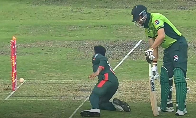 কিন্তু মিরাজ পিছু ছাড়েননি। পা দিয়ে বল ঠেকিয়ে দেন তিনি। সালমান আঘা তখন চেষ্টা করেন নিচু হয়ে বল ধরতে। কিন্তু তার আগেই মিরাজ দ্রুতগতিতে বল ধরে আন্ডারআর্ম থ্রোয়ে সরাসরি স্টাম্পে লাগান বল। আঘা ক্রিজের বেশ বাইরে।