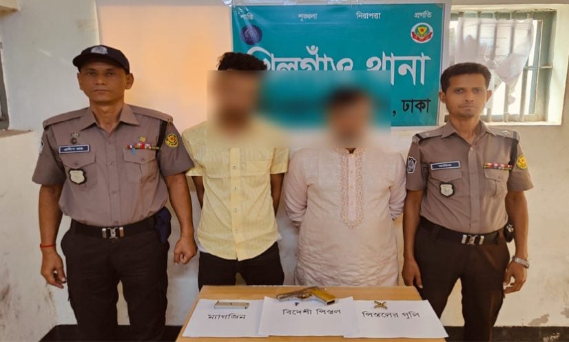 ঢাকা: রাজধানীর খিলগাঁও এলাকায় অভিযান চালিয়ে একটি বিদেশি পিস্তল, চার রাউন্ড গুলি, একটি ম্যাগাজিন ও একটি প্রাইভেটকারসহ মো. সাফায়েত হোসেন ওরফে সেন্টু (৪৪) ও মো. সবুজ ওরফে ইমন (২৫) নামের দুইজনকে গ্রেফতার করেছে খিলগাঁও থানা পুলিশ।