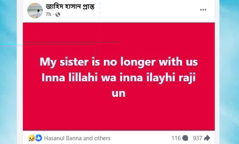 বৃষ্টির ভাই জাহিদ হাসান প্রান্ত তার বোনের মৃত্যুর খবর জানিয়ে শনিবার (২৫ এপ্রিল) সকাল সাড়ে ৯টার দিকে সামাজিক যোগাযোগমাধ্যম ফেসবুকে একটি পোস্ট দেন। পোস্টে তিনি লিখেছেন, ‘আমার বোন আর নেই। ইন্না লিল্লাহি ওয়া ইন্না ইলাইহি রাজিউন।’