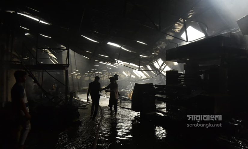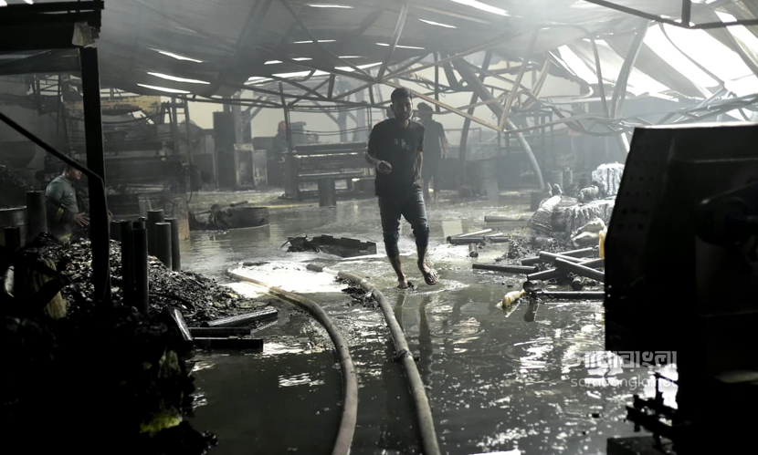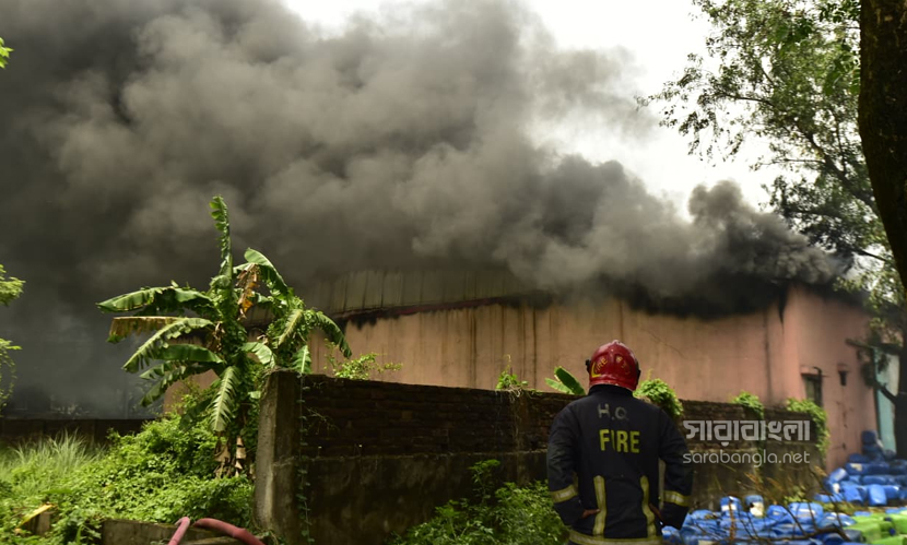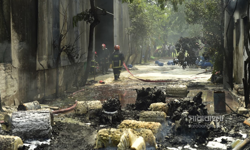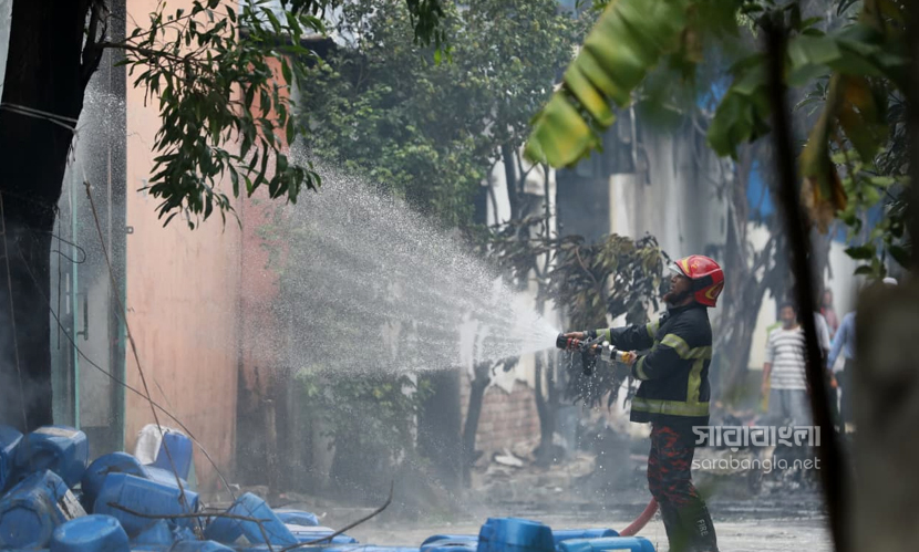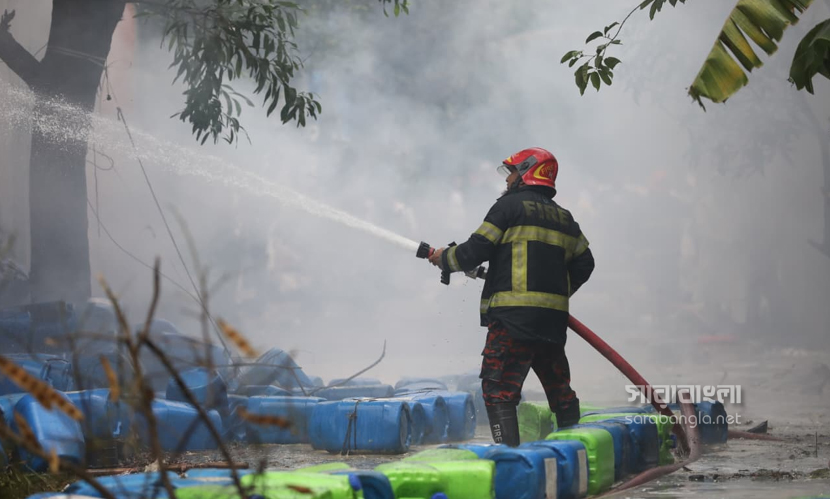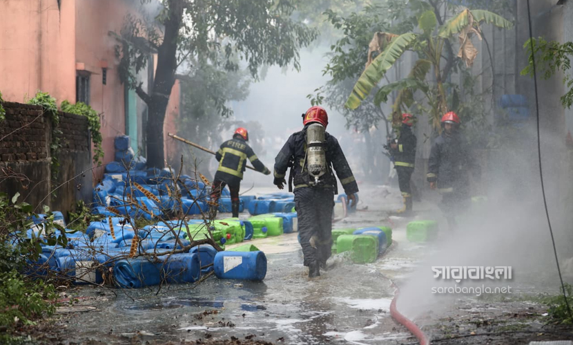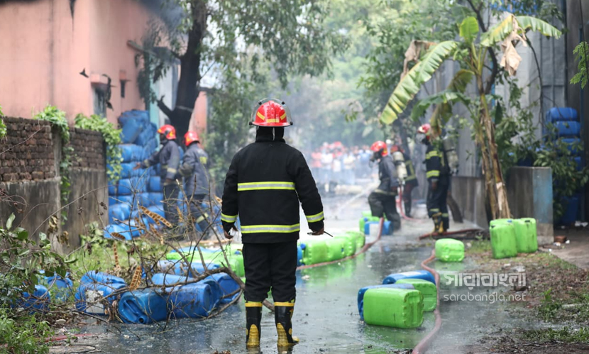 রাজধানীর ডেমরায় টিনশেড কালি তৈরির কারখানায় আগুন লেগেছিল। বৃহস্পতিবার (৩০ এপ্রিল) বেলা ১১টা ৩৮ মিনিটে আগুনের সূত্রপাত হয়। এর পর পর্যাক্রমে ফায়ার সার্ভিসের আটটি ইউনিট দুপুর ১টা ৫৫ মিনিটে আগুন নিয়ন্ত্রণে আনে। আগুনে বিভিন্ন ক্ষতিকর কেমিক্যাল ছড়িয়ে যায়। ইথাইল, থিনারসহ মারাত্নক কেমিক্যাল ছিল কারখানা দুটিতে। কিন্তু তাদের ছিল না কোনো সেফটি প্ল্যান। এমনকি আবাসিক এলাকায় এ ধরনের কেমিক্যাল কারখানা কীভাবে গড়ে উঠেছে সেটা নিয়েও প্রশ্ন দেখা দিয়েছে। এদিন আগুনের ছবিগুলো সরেজমিনে তুলে এনেছেন সারাবাংলার সিনিয়র ফটো করেসপন্ডেন্ট হাবিবুর রহমান।