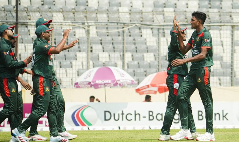 বাংলাদেশের পক্ষে নাহিদ রানা ১০ ওভারে ৩২ রান খরচায় নিয়েছেন ৫ উইকেট। ৩২ রানে দুই উইকেট নিয়েছেন শরিফুল ইসলাম।