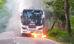 সংঘর্ষের পর বাসে ধরলো আগুন, দগ্ধ শিক্ষক